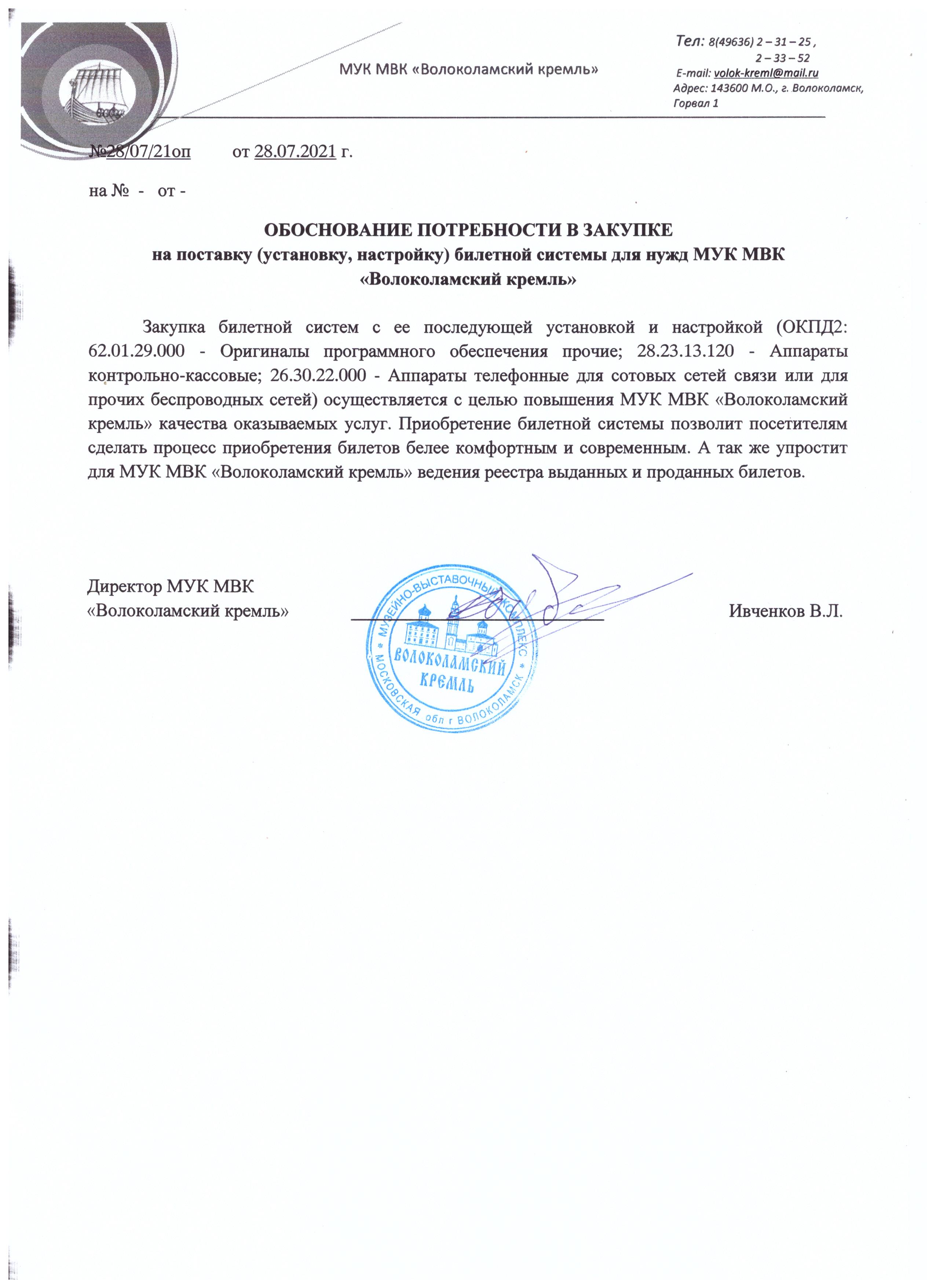Поставка (установка, настройка) билетной системы для нужд МУК МВК «Волоколамский кремль»